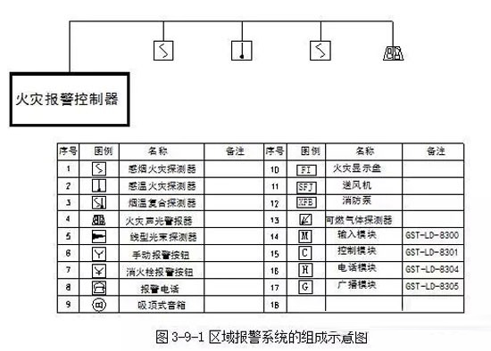 區(qū)域報警系統(tǒng)由火災(zāi)探測器、手動火災(zāi)報警按鈕、火災(zāi)聲光警報器及火災(zāi)報警控制器等組成,系統(tǒng)中可包括消防控制室圖形顯示裝置和指示樓層的區(qū)域顯示器。區(qū)域報警系統(tǒng)的組成如圖3-9-1所示。