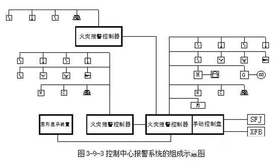 控制中心報警系統(tǒng)由火災(zāi)探測器、手動火災(zāi)報警按鈕、火災(zāi)聲光警報器、消防應(yīng)急廣播、消防專用電話、消防控制室圖形顯示裝置、火災(zāi)報警控制器、消防聯(lián)動控制器等組成,且包含兩個及兩個以上集中報警系統(tǒng)。控制中心報警系統(tǒng)的組成如圖3-9-3所示。