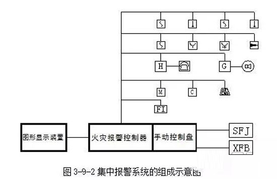 集中報警系統(tǒng)由火災(zāi)探測器、手動火災(zāi)報警按鈕、火災(zāi)聲光警報器、消防應(yīng)急廣播、消防專用電話、消防控制室圖形顯示裝置、火災(zāi)報警控制器、消防聯(lián)動控制器等組成。集中報警系統(tǒng)的組成如圖3-9-2所示。
