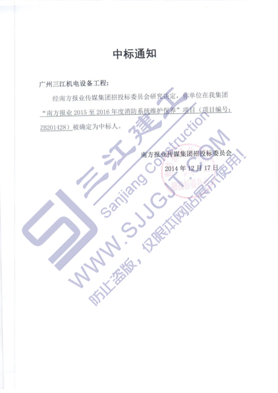 熱烈祝賀我司中標南方報業(yè)2015至2016年度消防系統(tǒng)維護保養(yǎng)項目